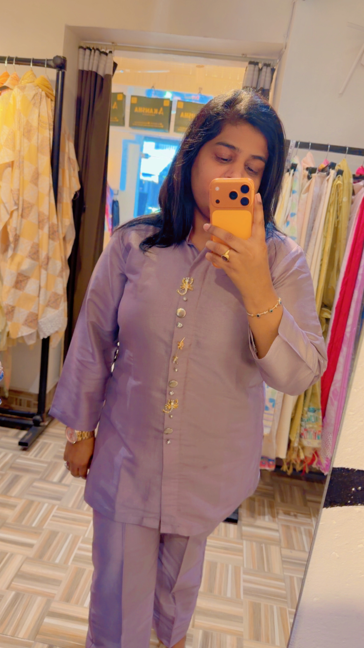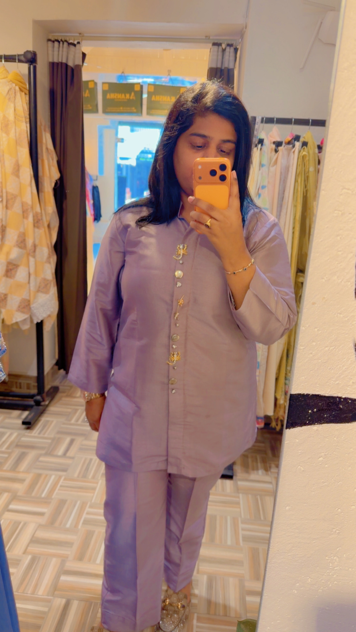 Elevate your everyday elegance with this beautifully tailored Lilac Co-ord Set featuring delicate gold embellishment detailing on the front placket. Designed for women who love minimal sophistication, this ensemble blends comfort with refined luxury.