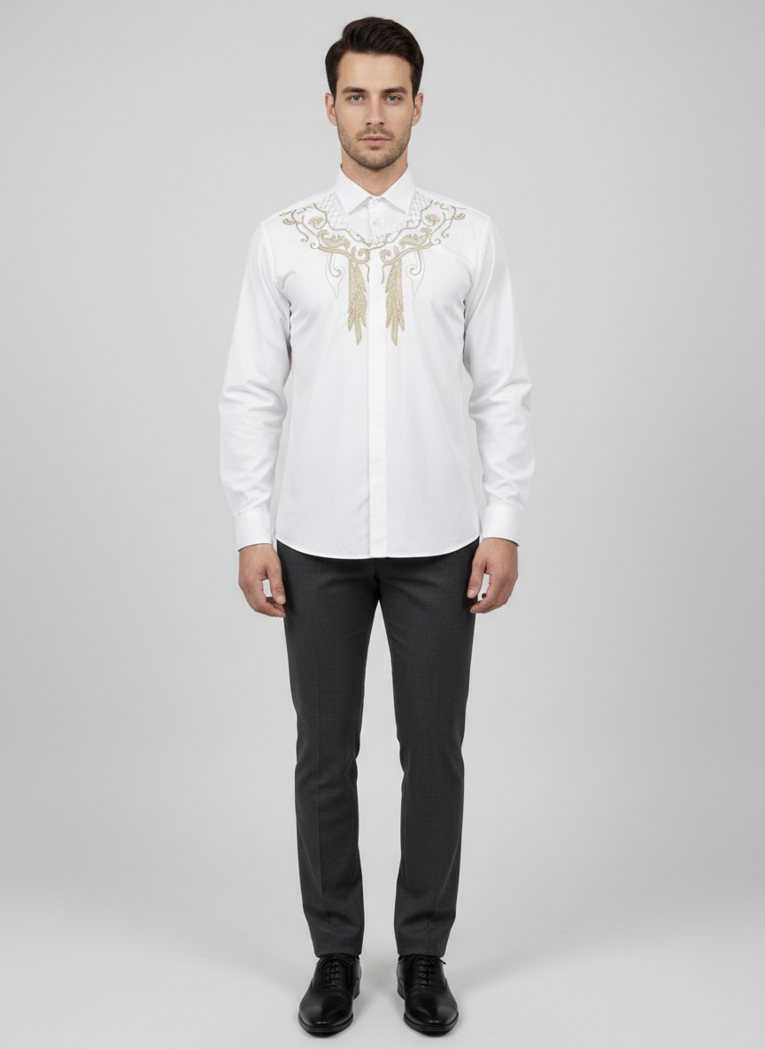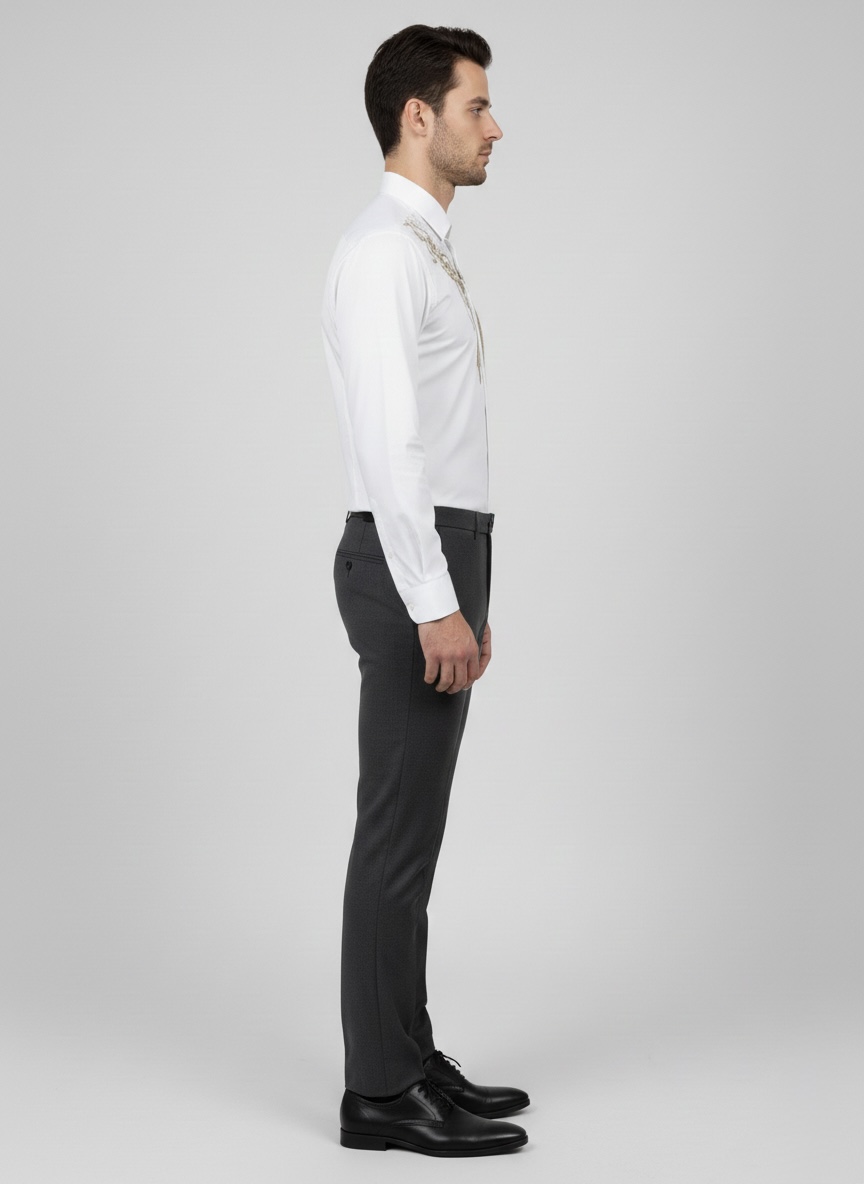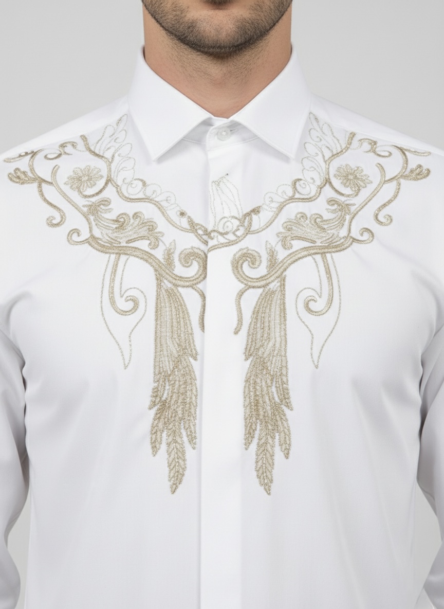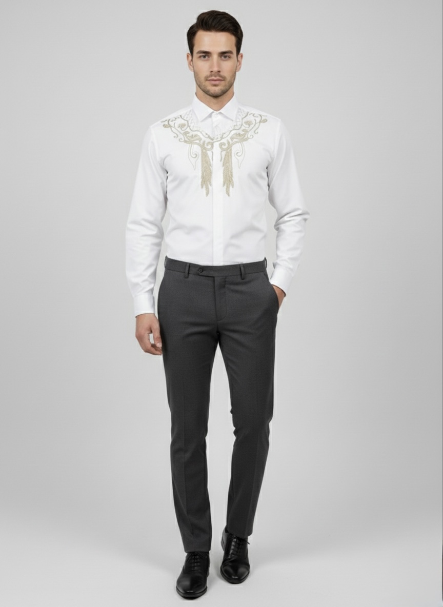 Upgrade your formal wardrobe with this sophisticated Men’s White Designer Shirt, crafted for the modern gentleman. Featuring subtle linear detailing on the shoulders, this shirt blends minimal design with statement style.