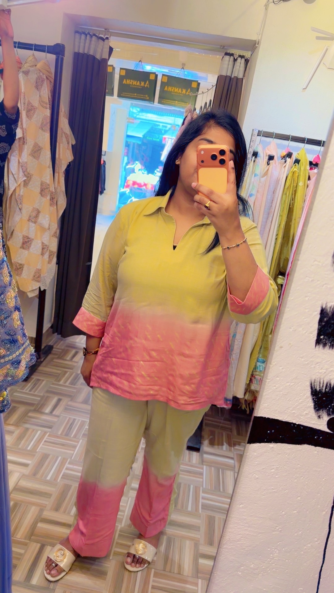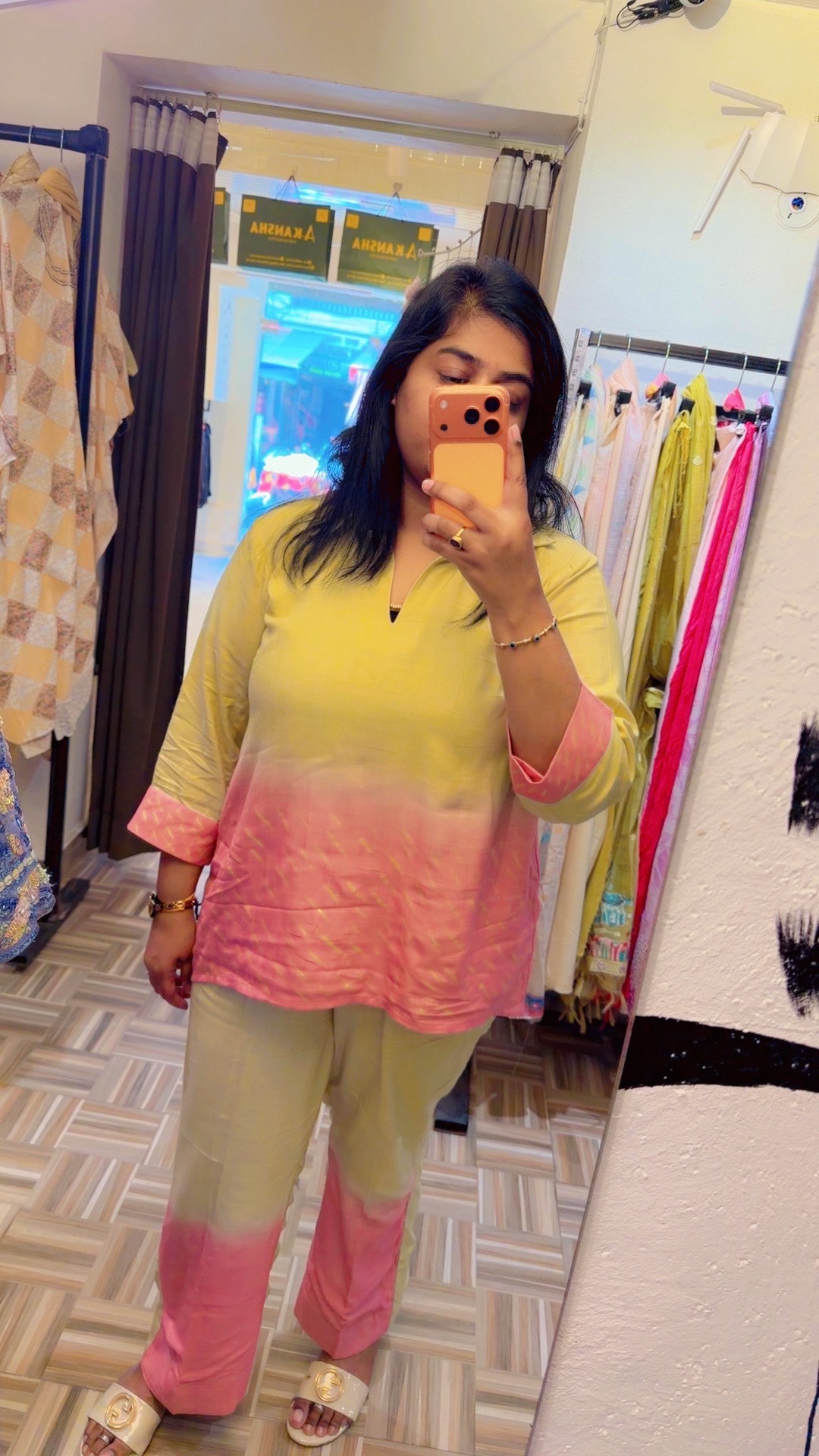 Bring effortless freshness to your wardrobe with this beautiful Pastel Ombre Co-ord Set. Designed in soothing yellow and pink hues, this set offers a soft gradient effect that feels light, elegant and perfect for summer days.